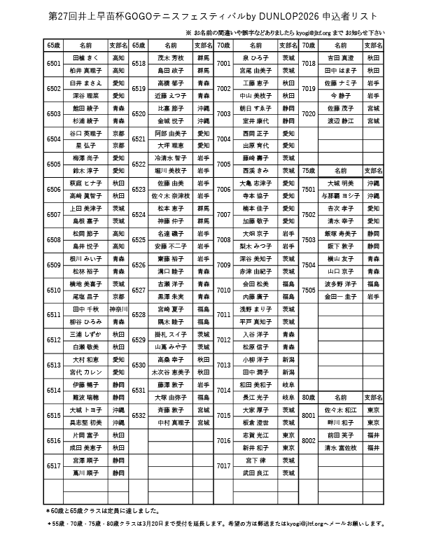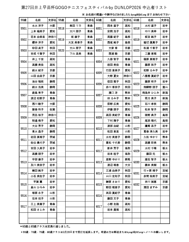 *55歳・70歳・75歳・80歳クラスは3月20日まで受付を延長します。