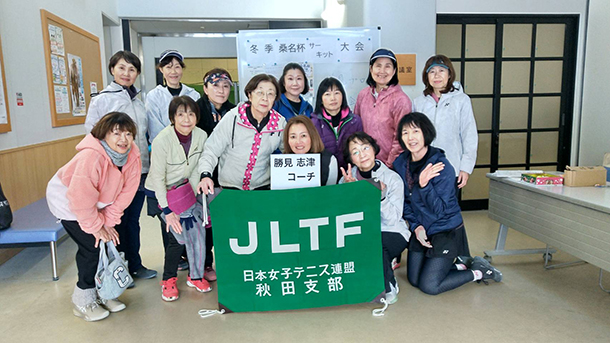 1月28日(水)の11時から15時(昼休憩約1時間)まで、秋田市北野田公園アリーナテニスコートにて秋田県支部主催の技術講習会が開催され、下は30代から上は70代までと幅広い年齢層の計24名((中級12 人・上級12 人)が参加した。