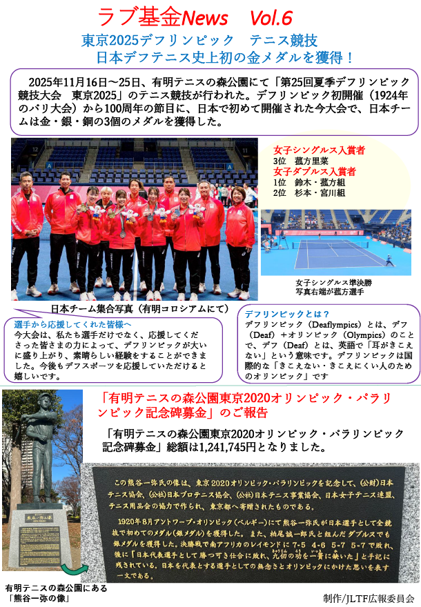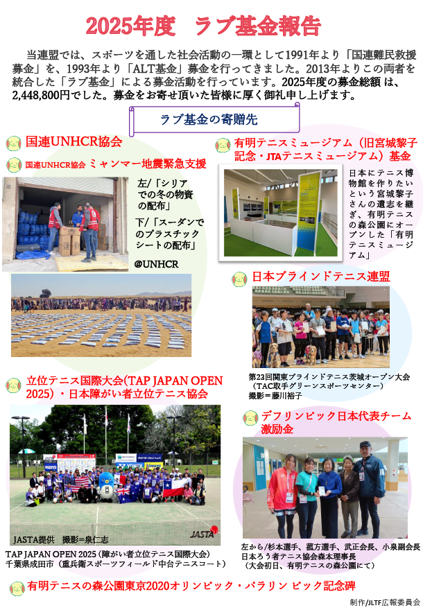 当連盟では、1991年より開始した「国連難民救援募金(難民教育基金)」と1993年より開始した「ALT募金(All Japan Ladies Tennisの略)」を統合して「ラブ基金」と命名し、2013年度より募金活動を行っています。各支部や有志の皆様から集められた「ラブ基金」とJLTFの会費からは「支援金」や「激励金」という形で、全国各地の被災地や支援団体等にお送りしています。今年度の「ラブ基金」の募金総額は2,038,750円でした。皆様のご理解とお気持ちに厚く御礼申し上げます。