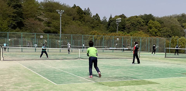 4月12日、出雲真幸ヶ丘公園テニスコートで行われた「会員お楽しみ大会」は、個人でもペアでもエントリー可能とし、当日のくじ引きでチーム分けをして(6~7人の4チーム)団体戦を行いました。この大会はコロナ禍も少し落ち着いて来た中でのカムバックキャンペーンの一環として、65歳以上の参加料を無料とし、テニスレッスンやテニス用品(ウェア、ソックス)などのリサイクル販売、支部賛助会員さんによるブース出店など、盛りだくさんな企画も用意しました。