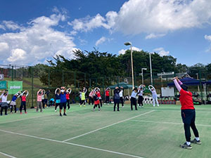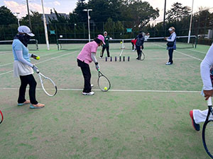 前半は、準備体操の後、岡川理事長のボール出しにより「ハッピーゾーンからの足元のボールと高いボールの返球」を全員でレッスン。その後、5ゲーム先取ノードバンテージ方式での親睦ゲームを行った。