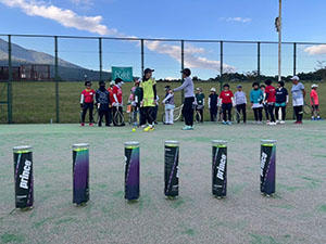 初日は準備体操で体をほぐした後、グローブライド㈱の山本プロのレッスンでウォーミングアップ。その後、的当てやボール転がし競争などのチーム対抗戦を行い、最後に4ゲーム先取の親睦試合で気持ち良い汗を流した。