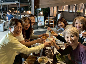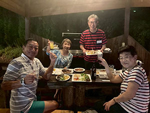夜の懇親会では賛助テニス旅行初の試みのバーベキューパーティが行われ、楽しく賑やかなひと時を過ごした。会の半ば、80歳以上の会員さんの表彰や地元のお菓子屋さん特製「寿印入り亀形どらやき」のプレゼントもあり、恒例はずれクジなしの抽選会で盛り上がった。