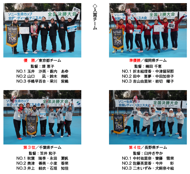 例年11月初旬に開催されていた「全国レディーステニス全国決勝大会」は、代表決定戦である都道府県大会の開催時期を考慮(猛暑期を回避)して、今年から12月の開催となった。またコートも屋内外でハードコートのみを使用することも初の試みであった。初日は小雨が混じる曇天であったため試合方法を変更して行ったが、2日め以降は天気も回復し、各コートで熱戦が繰り広げられた。結果は、優勝が東京都、準優勝は福岡県、3位は千葉県、そして4位は19年ぶりの「卒業」となった長野県だった。