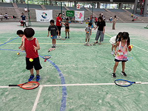 FETでは、初めてラケットを持つ子供達から日頃、テニスに親しんでいる子供達がいたが、特に初めての子供達が「もっとテニスをやってみたい」「来年も参加したい」と思ってもらえるように、宮崎指導員に色々なメニューを考えて頂き、楽しく充実した内容となった。