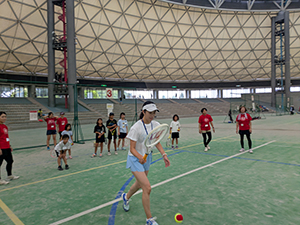 8月7日(木)10時~15時、「パークドーム熊本」3面で、本部より宮崎優実講師を迎えてFET&技術講習会を開催した。午前中のFETには子供29人(3歳から小6)、保護者17人が参加し、準備体操のあと「セルフボールキャッチ」や二人組で「ボールコロコロ」などのボール遊びを親子一緒にしてもらった。後半はラケットを使ってのボール遊びから年齢別に分かれて球出しでボールを打った。