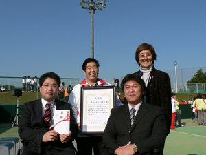 | ● 日本車いすテニス協会へジュニア用競技車いす・10台を寄贈 また、パラリンピック参加費用として10万円も併せて寄付しました。 11/5(水) 全国レディース大会全国決勝大会 開会式にて ジュニア用車いす10台 および パラリンピック参加費用の寄付10万円を 辻会長にお渡ししました。 日本車いすテニス協会からは「感謝状」を受け取りました。。 |