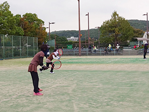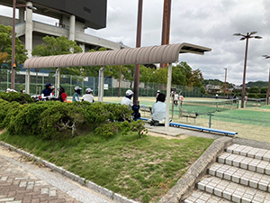 当日は雨予報で開催があやぶまれましたが、そこは、晴れの国、岡山! どうにか天気は持ち、薄曇りのちょうど良いテニス日和となりました。