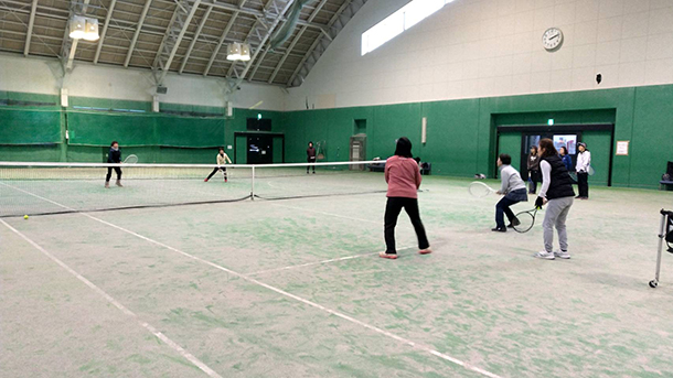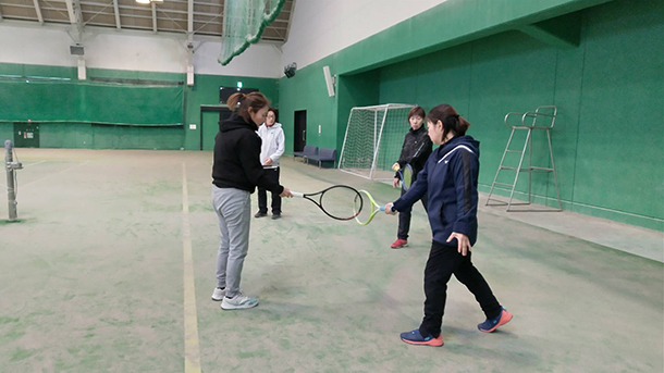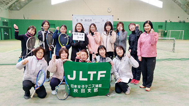1月28日(水)の11時から15時(昼休憩約1時間)まで、秋田市北野田公園アリーナテニスコートにて秋田県支部主催の技術講習会が開催され、下は30代から上は70代までと幅広い年齢層の計24名((中級12 人・上級12 人)が参加した。