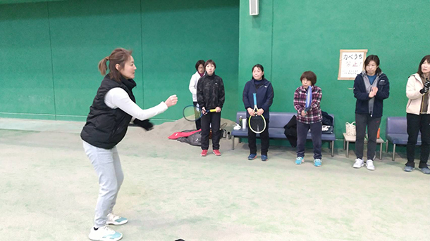 勝見講師は「午前、午後とも参加者が12人ずつだったので、テーマを絞って濃い練習ができたと思う」と感想を話した。また参加者からは、「前半の基礎知識のレッスンで “小指をしっかり握るとラケットを振らないでボレーが打てる”ことを教わり、目からうろこだった」「コートを4つのエリアに分け、一球打つごとにエリアを移動しながらラリーする練習を行い、ったが、全国レディースの入賞チームのように、コート上のどこからでも同じレベルの球が安定して打てるようになると良いと思った」「形式練習ではまずセンターに配球し、空きスペースを作ってからの展開を行い、意識してボールを回すことの重要性を痛感した」「分かりやすく細かく丁寧に教えてもらい、ラリー練習では全員と球を打ちあって下さって嬉しかった」等の感想が聞かれた。